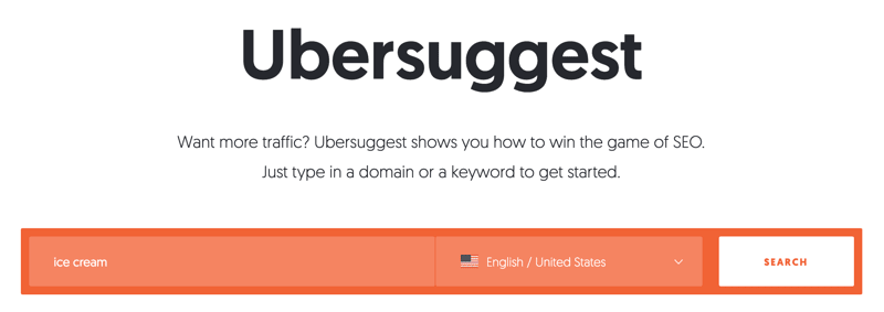 Step #1 - Head over to Ubersuggest and type in a keyword phrase you want to write a blog post on and click "Search". Ideally, you will want to pick a one or two-word key phrase such as "ice cream" and make sure it contains a keyword you're targeting.