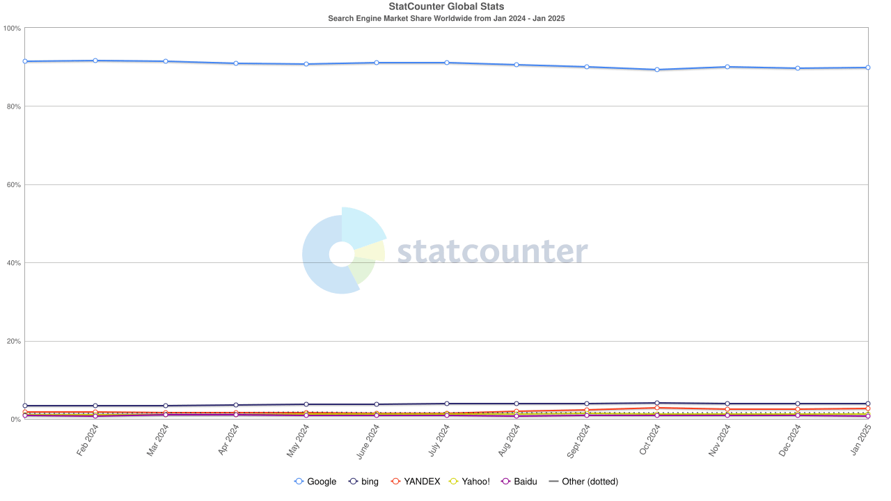 | For the first time in 10 years, Google's global search market share dipped below 90% in the last quarter of 2024—but that's not the whole story. In the U.S., Google actually hit above 90% for the first time ever in November of 2024, according to StatCounter. And for mobile searches, Google's market share worldwide is still well above 90%. But other search engines are picking up queries—not necessarily at the expense of Google, but in addition to the searches that are happening there. For example, Bing went from 3.37% to 3.97% over the last year. It's still tiny compared to Google, but it also powers a lot of other search platforms, including ChatGPT Search. I have no doubt that Google will keep playing a major role in search for years to come. But you also need to optimize for niche platforms your audience might be using. My team can help you find out which ones to focus on, and how to optimize your content for maximum visibility online. Reach out to discuss your SEO strategy. To learn more about the importance of search everywhere optimization, check out this article on my blog. Cheers, Neil Patel